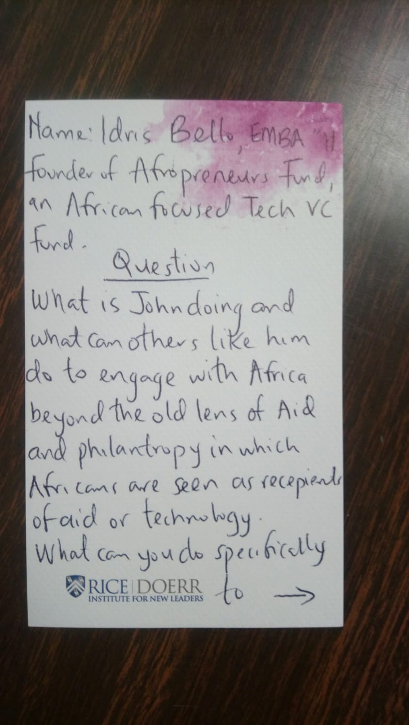 I also got lucky to be one of the two people that John took questions from. My question was on how folks like John could engage with the African continent beyond the usual lens of aid and philanthropy. He responded on how there needs to be more investments into the continent and also how the world needs to rally towards solving the climate change issue as the consequences are going to be disproportionately felt by those in Africa and the rest of the developing world!