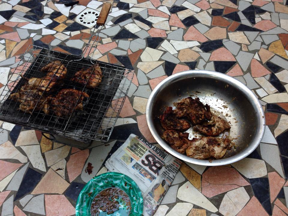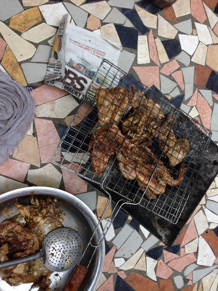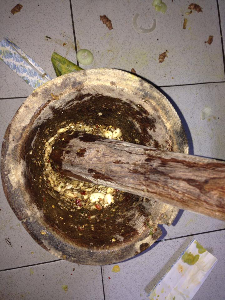They pounded and grounded (using a mortar and pestle) the pepper and then the other ingredients. The grilled the chucked over open fire, fried the onions over the fire, and slices and diced.
